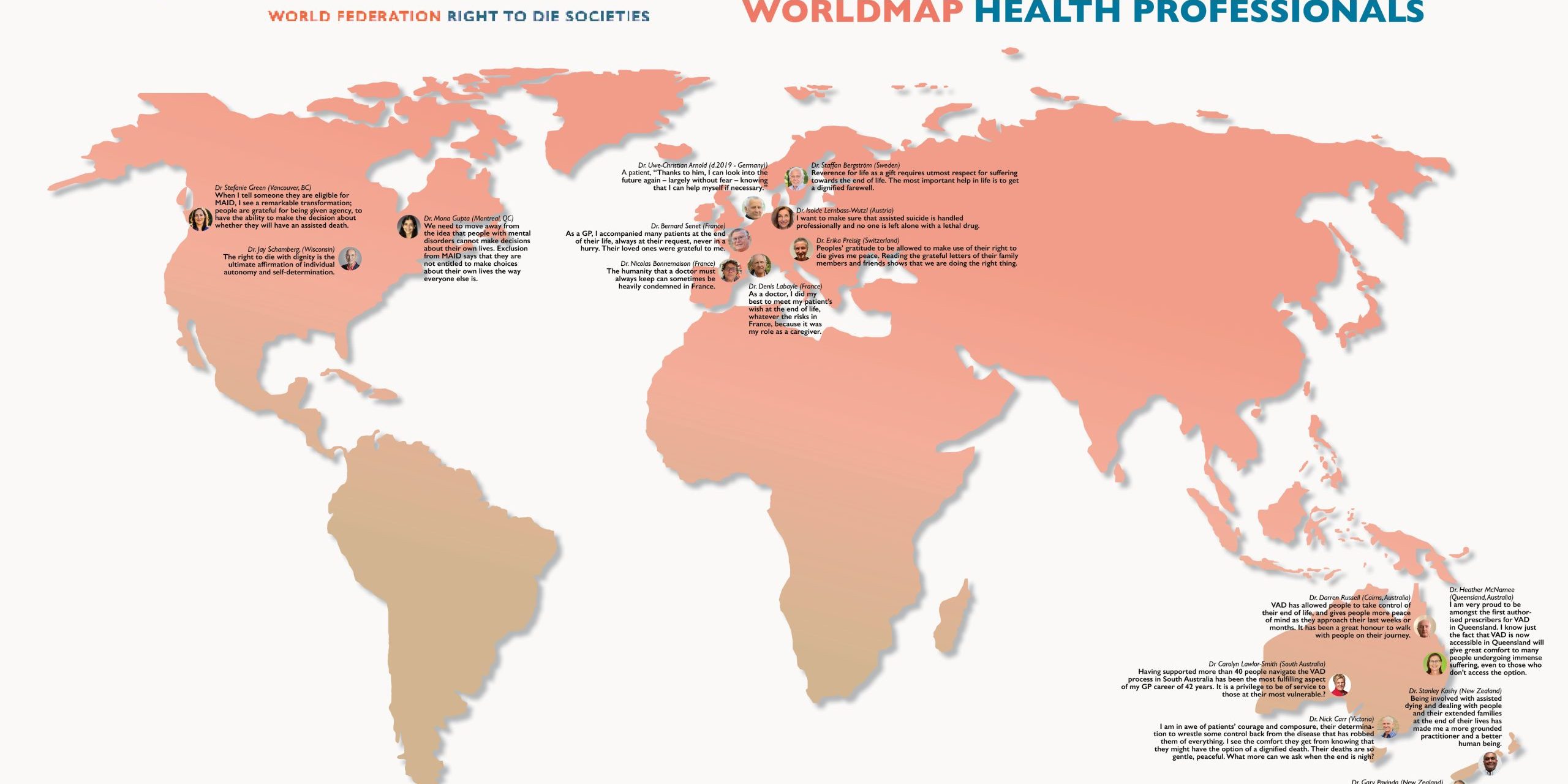 Cette année l’association internationale WFRtDS « World Federation Right to Die Societies » dont nous sommes membres met à l’honneur les médecins et les soignants qui répondent aux demandes des patients lorsque les thérapies échouent à les guérir et à apaiser leur souffrances tant physiques que morales Ce dernier soin qu’ils accomplissent par compassion, demeure illégal en France, et les expose à être attaqué en justice et à perdre le droit à l’exercice de leur profession par le Conseil de l’ordre.