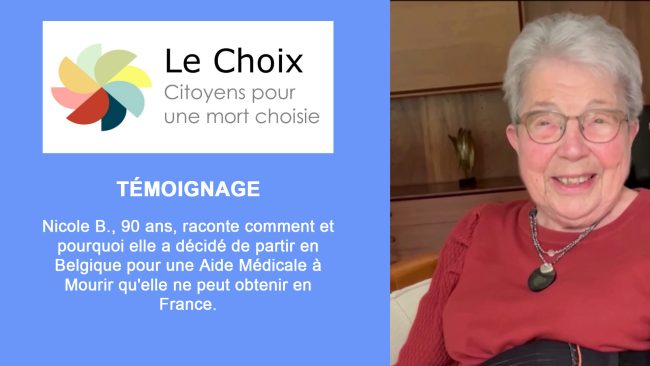 Dans cette vidéo Nicole B. 90 ans raconte comment et pourquoi elle a décidé de partir en Belgique pour une Aide Médicale à Mourir qu’elle ne peut obtenir en France. Son témoignage a été recueilli par Annie Wallet par téléphone au cours d’un dernier entretien avec elle.