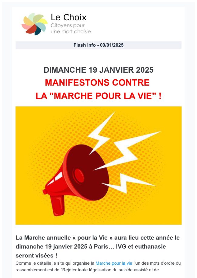 DIMANCHE 19 JANVIER 2025 MANIFESTONS CONTRE LA « MARCHE POUR LA VIE » ! La Marche annuelle « pour la Vie » aura lieu cette année le dimanche 19 janvier 2025 à Paris… IVG et euthanasie seront visées ! Lorem ipsum dolor sit amet, consectetur adipiscing elit. Ut elit tellus, luctus nec ullamcorper mattis, pulvinar dapibus leo.…