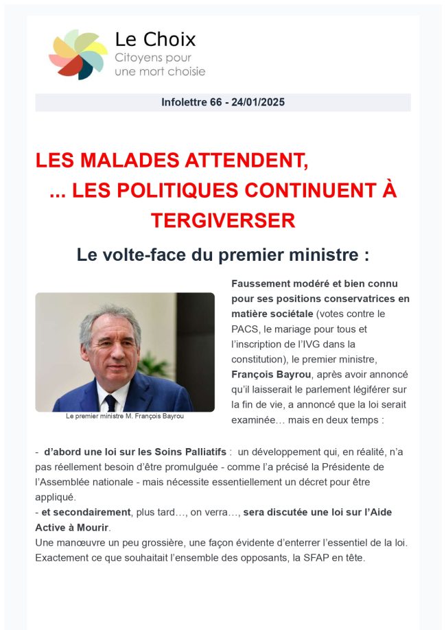 LES MALADES ATTENDENT, … LES POLITIQUES CONTINUENT À TERGIVERSER Le volte-face du premier ministre : Le premier ministre M. François Bayrou Faussement modéré et bien connu pour ses positions conservatrices en matière sociétale (votes contre le PACS, le mariage pour tous et l’inscription de l’IVG dans la constitution), le premier ministre, François Bayrou, après avoir…
