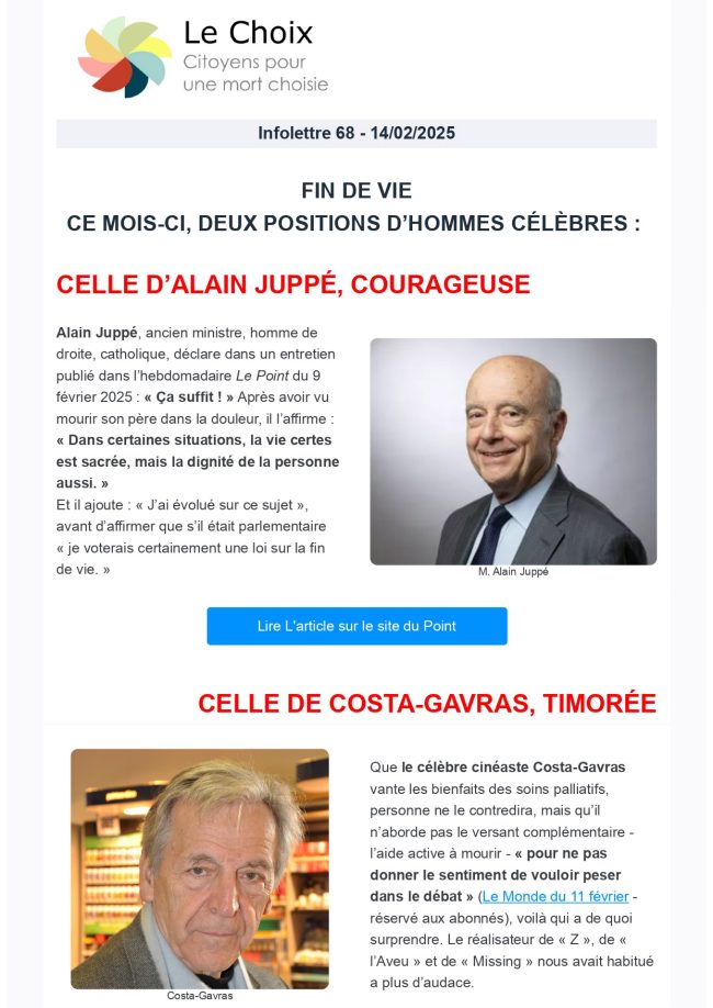 Alain Juppé, ancien ministre, homme de droite, catholique, déclare dans un entretien publié dans l’hebdomadaire Le Point du 9 février 2025 : « Ça suffit ! » Après avoir vu mourir son père dans la douleur, il l’affirme : « Dans certaines situations, la vie certes est sacrée, mais la dignité de la personne aussi. » Et il ajoute : « J’ai…