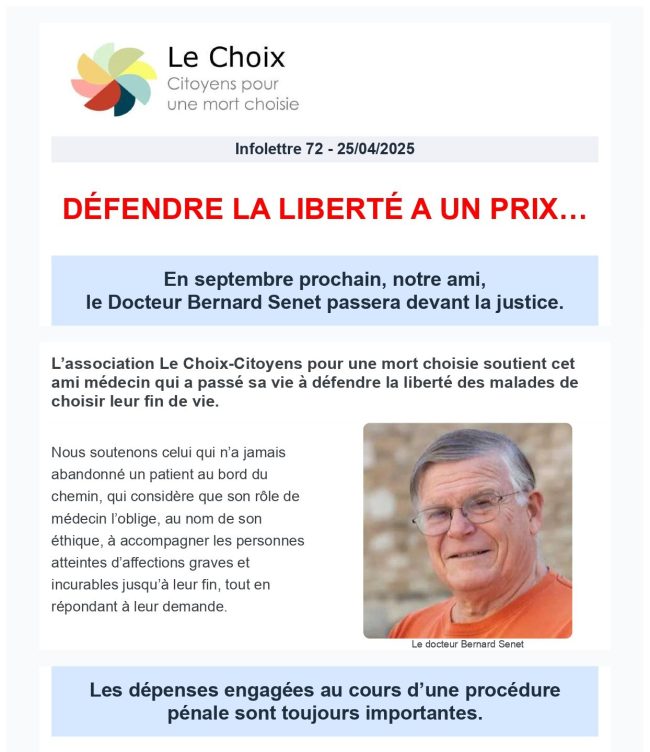 DÉFENDRE LA LIBERTÉ A UN PRIX… En septembre prochain, notre ami, le Docteur Bernard Senet passera devant la justice. L’association Le Choix-Citoyens pour une mort choisie soutient cet ami médecin qui a passé sa vie à défendre la liberté des malades de choisir leur fin de vie. Nous soutenons celui qui n’a jamais abandonné un…