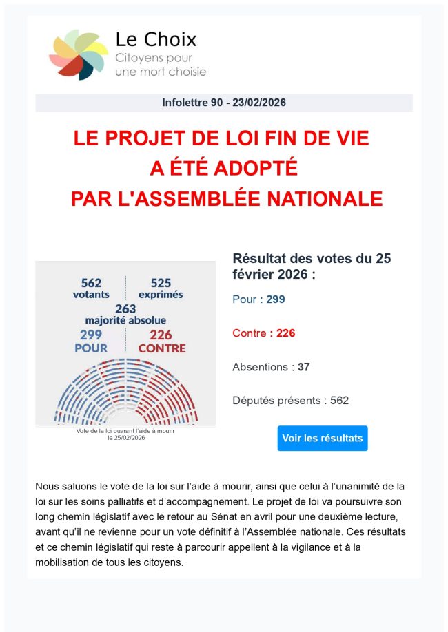 LE PROJET DE LOI FIN DE VIE A ÉTÉ ADOPTÉ PAR L’ASSEMBLÉE NATIONALE Vote de la loi ouvrant l’aide à mourir le 25/02/2026 Votes du 25 février 2026 : Pour : 299 Contre : 226 Absentions : 37 Députés présents : 562 Voir les résultats Nous saluons le vote de la loi sur l’aide à…