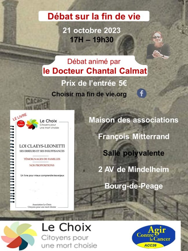 Débat sur la fin de vie organisé par un membre du Choix, monsieur Alain Fournier : le docteur Chantal Calmat, membre de la commission médicale du Choix répondra à vos questions. Elle apportera quelques livres du docteur Denis Labayle ainsi que des livrets sur les erreurs et insuffisances de la loi Claeys-Leonetti …